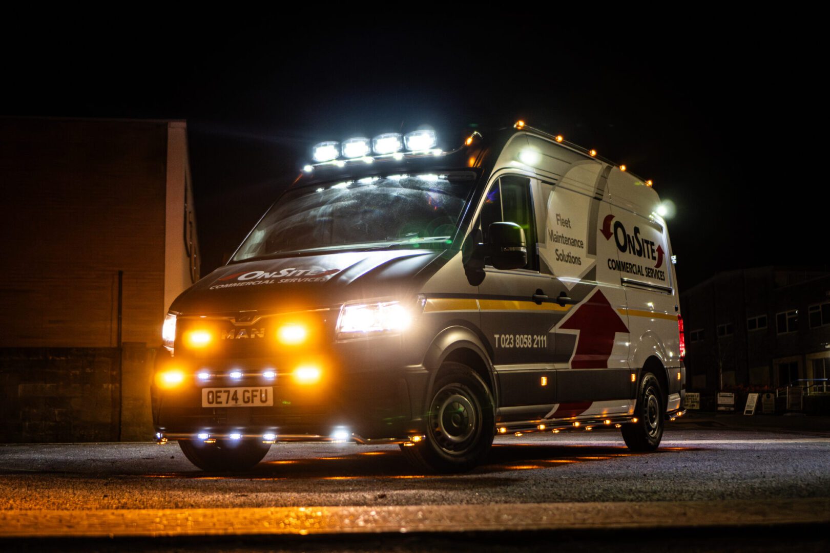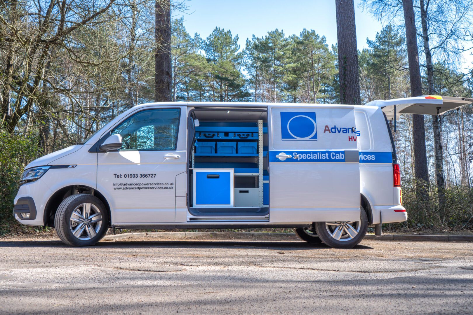 VRS converted this Renault Master into an efficient mobile workspace with structured storage, removable parts bins, and a durable workbench. Bright work lights, amber warning lights, and 12V/24V jump starts support safe roadside use, while the clear central aisle keeps everything accessible and organised.
